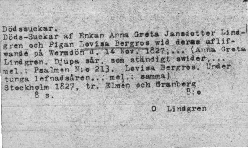 //// Döds suckar. //// Döds-Suckar af Enkan Anna Greta Jansdotter Lindgren och Pigan LevIsa Bergros wid deras aflif-wande på -182?,... (Anfta Örets //// Lindgren. Djupa sår, som ständigt swider, . mel,: Psalmen N: e 2X3. Lovisa Bergros. Under tunga lefnadsåren.mel,; samma) Stockholm lfi27, tr. Slmén och Sranberg //// ¦¦¦ 8 3. . 8:o //// 0 Lindgren ////