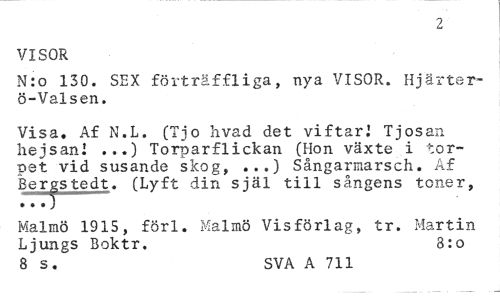 //// 2 //// VISOR //// N:o 130. SEX förträffliga, nya VISOR. Hjärter-ö-Valsen. //// Visa. Af N.L. (Tjo hvad det viftar] Tjosan hejsanl ...) Torparflickan (Hon växte i torpet vid susande skog, ...) Sångarmarsch. Af Bergstedt. (Lyft din själ till sångens toner, //// Malmö 1915, förl. Malmö Vis förlag, tr. Martin Ljungs Boktr. 3:o //// 8 s. SVA A 711 ////