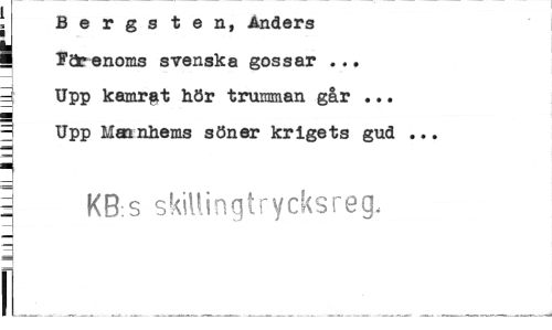 //// ; Bergsten, Anders //// B Jap-enoms svenska gossar ... //// 3 Upp kamrat liör trumman går ... //// 3 Upp Marnhems söner krigets gud ... //// a //// i KB.s skillingtrycksreg, //// | //// ^___ ////