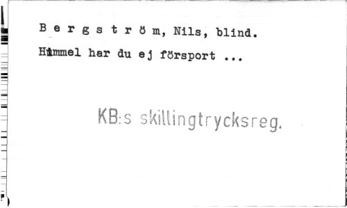 //// \i Bergström, Nils, blind. Himmel ber du ej försport ... //// " KB:S skillingtrycksreg. //// ¦ v ////