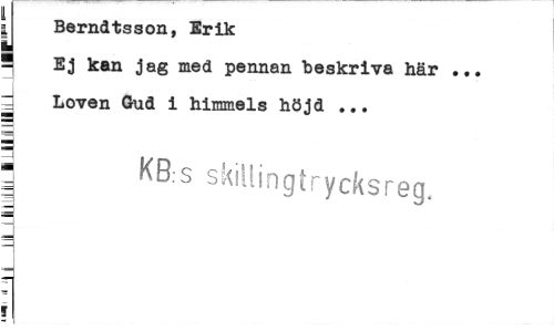//// i Berndtsson, Erik //// ¦ Ej kan jag med pennan beskriva här ... j Loven Gud i himmels höjd ... //// S //// g KB.s skillingtrycksreg. //// - //// ¦ ////
