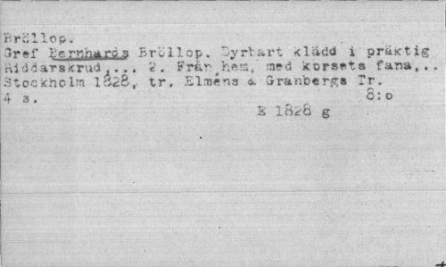 //// Bröllop. //// 3r«f Be rnharö a Bröllop. ."Dyrbart <ladd i präktig iUddarsicrud^ .., 'i. Frär^hea," med korsets fana,.. Stockholm 1328, tr. Elména Granbergs Tr. 4s. o:o //// E 1828 g ////