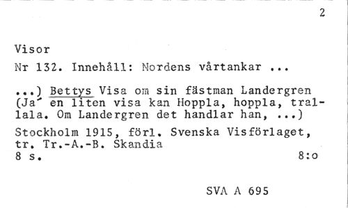 //// 2 //// Visor //// Nr 132. Innehåll: Mordens vårtankar ... //// ...) Bettys Visa om sin fästman Landergren (Ja" en liten visa kan Hoppla, hoppla, tral-lala. Om Landergren det handlar han, ..,) //// Stockholm 1915, förl. Svenska Visförlaget, tr. Tr.-A.-B. Skandia //// 8 s. 8:o //// SVA A 695 ////