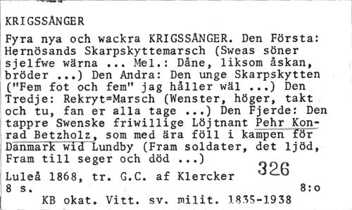 //// KRIGSSÅNGER //// Fyra nya och wackra KRIGSSÅNGER. Den Första: Hernösands Skarpskyttemarsch (Sweas söner sjelfwe wärna ... Mel.: Dåne, liksom åskan, bröder ...) Den Andra: Den unge Skarpskytten ("Fem fot och fem" jag håller wäl ...) Den Tredje: Rekryt=Marsch (Wenster, höger, takt och tu, fan er alla tage ...) Den Fjerde: Den tappre Swenske friwillige Löjtnant Pehr Konrad Betzholz, som med ära föll i kampen för Danmark wid Lundby (Fram soldater, det ljöd, Fram till seger och död ...) //// Luleå 1868, tr. G.C. af Klercker ^^ 8 s. 8:0 //// KB okat. Vitt. sv, milit. 1835-1938 ////