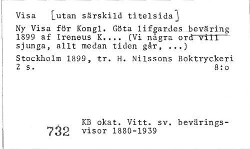 //// Visa [utan särskild titelsidaj //// Ny Visa för Kongl. Göta lifgardes beväring 1899 af Ireneus K... (Vi några ord Vill" sjunga, allt medan tiden går, ...) //// Stockholm 1899, tr. H. Nilssons Boktryckeri 2 s. 8:o //// KB okat. Vitt. sv. bevärings- //// år i visor 1800-1879 ////