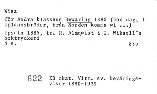 //// Wisa //// för Andra klassens Bewäring 1886 (God dag, I Uplandsbröder, från Norden komma wi ...) //// Upsala 1886, tr. R. Almqwist & I. Wiksell^s boktryckeri //// 4 s. 8:o //// £43 KB okat. Vitt. sv. bevärings- //// w visor 1880-1939 ////