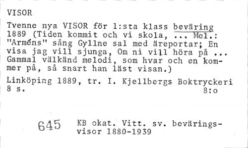 //// VISOR //// Tvenne nya VISOR för l:sta klass beväring 1889 (Tiden kommit och vi skola, ... Mel.: "Arméns" sång Gyllne sal med äreportar; En visa jag vill sjunga, Om ni vill höra på ... Gammal välkänd melodi, som hvar och en kommer på, så snart han läst visan.) //// Linköping 1889, tr. I. Kjellbergs Boktryckeri 8 s. 8:o //// KB okat. Vitt. sv. bevärings- //// visor 1880-1939 ////