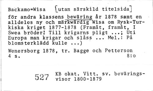 //// Backamo=Wisa tutan särskild titelsida] //// för andra klassens bewäring år 1878 samt en alldeles ny och märkwärdig Wisa om Rysk-Turkiska kriget 1877-1878 (Framåt, framåt, I Swea bröder! Till krigarns pligt ...; Uti Europa man krigar och slåss ... Mel.: På blomsterklädd kulle ...) //// Wenersborg 18 78, tr. Bagge och Petterson 4 s. 8: o //// KB okat. Vitt. sv. bevärings- //// år i visor 1800-1879 ////