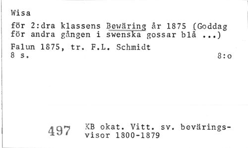 //// Wisa //// för 2: dra klassens B ev; ä ring år 1875 (Goddag för andra gången i swenska gossar blå ...) //// Falun 1875, tr. F.L. Schmidt 8 s. 8: o //// i nn XB okat. Vitt. sv. bevärines- //// visor 1800-1879 ////