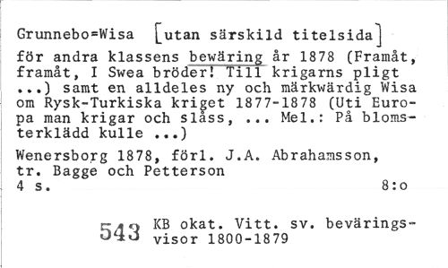 //// Grunnebo=Wisa [utan särskild titelsida] //// för andra klassens bewäring år 1878 (Framåt, framåt, I Swea bröder! Till krigarns pligt ...) samt en alldeles ny och märkwärdig Wisa om Rysk-Turkiska kriget 1877-1878 (Uti Europa man krigar och slåss, ... Mel.: På blomsterklädd kulle ...) //// Wenersborg 1878, förl. J.A. Abrahamsson, tr. Bagge och Petterson //// 4 s. 8:o //// rnf* KB okat. Vitt. sv. bevärings- //// OtJU visor 1800-1939 ////