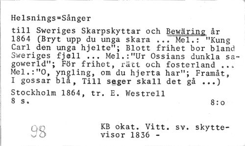 //// Helsnings=Sånger //// till Sweriges Skarpskyttar och Bewäying år 1864 (Bryt upp du unga skara ... Mel.: "Kung Carl den unga hjelte"; Blott frihet bor bland Sweriges fjell ... Mel.:"Ur Ossians dunkla sa-gowerld"; För frihet, rätt och fosterland ... Mel.:"O, yngling, om du hjerta har"; Framåt, I gossar blå, Till s^ger skall det gå ...) //// Stockholm 1864, tr. E. Westrell 8 s. 8:o //// KB okat. Vitt. sv. skytte- //// ; 5 visor 1836 - ////