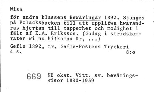 //// Wisa //// för andra klassens Bewäringar 1892. Sjunges på Polacksbacken till att upplifwa hwarand-ras hjertan till tapperhet och modighet i fält af K.A. Eriksson. (Godag i stridskamrater wi nu hitkomna är, //// Gefle 1892, tr. Gefle-Postens Tryckeri 4 s. 8: o //// CCQ KB okat. Vitt. sv. bevärings- //// u ' visor 1880-1939 ////