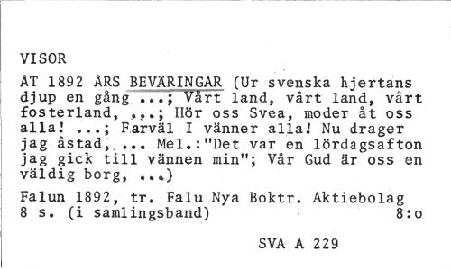 //// VISOR //// AT 1892 ÅRS BEVÄRINGAR (Ur svenska hjertans djup en gång ...; Vårt land, vårt land, vårt fosterland, ..,.; Hör oss Svea, moder åt oss alla.' ...; Farväl I vänner alla.' Nu drager jag åstad,... Mel.:"Det var en lördagsafton jag gick till vännen min"; Vår Gud är oss en väldig borg, .. //// Falun 1892, tr. Falu Nya Boktr. Aktiebolag //// 8 s. (i samlingsband) 8:o //// SVA A 229 ////