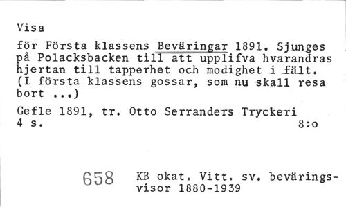 //// Visa //// för Första klassens Beväringar 1891. Sjunges på Polacksbacken till att uppiifva hvarandras hjertan till tapperhet och modighet i fält. (I första klassens gossar, som nu skall resa bort ...) //// Gefle 1891, tr. Otto Serranders Tryckeri 4 s. 8:o //// Ctrg KB okat. Vitt. sv. bevärings- //// visor 1880-1939 ////