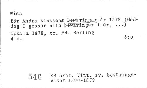 //// Wisa //// för Andra klassens Bewäringar år 18 78 (Goddag I gossar alla bewäringar i år, .,») //// Upsala 1878, tr. Ed. Berling 4 s. 8:o //// KB okat, Vitt. sv. bevärings- //// visor 1800-1879 ////