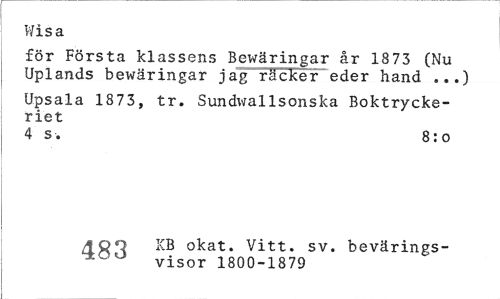 //// Wisa //// för Första klassens Bewäringar år 1873 (Nu Uplands bewäringar jag räcker eder hand ...) //// Upsala 1873, tr. Sundwallsonska Boktryckeriet //// 4 s. 8: o //// ^OO KB okat. Vitt. sv. bevärings- //// l±ou visor 1800-1879 ////