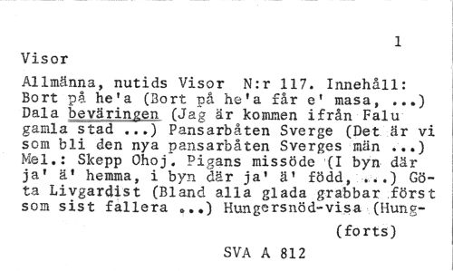 //// 1 //// Visor //// Allmänna, nutids Visor N:r 117. Innehåll: Bort på he'a (Bort på he'a får e' masa, ...) Dala beväringen (Jag är kommen ifrån Falu gamla stad ...) Pansarbåten Sverge (Det är vi som bli den nya pansarbåten Sverges män ...) Mel.: Skepp Ohoj". Pigans missöde (I byn där ja' ä' hemma, i byn där ja' ä1 född, ...) Göta Livgardist (Bland alla glada grabbar först som sist fallera ...) Hungersnöd-visa (Hung- //// (forts) //// SVA A 812 ////