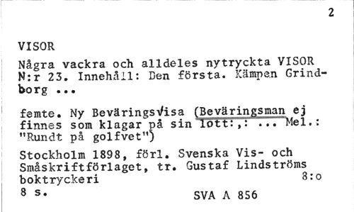 //// 2 //// VISOR //// Några vackra och alldeles nytryckta VISOR N:r 23. Innehåll: Den första. Kämpen Grindborg ... //// femte. Ny BeväringsVisa (Beväringsman ej finnes som klagar på sin lott:,:... Mel.: "Rundt på golfvet") //// Stockholm 1898, förl. Svenska Vis- och Småskriftförlaget, tr. Gustaf Lindströms boktryckeri 3:o //// 8 s* SVA A 856 ////