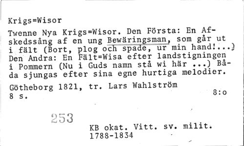 //// Krigs=Wisor //// Twenne Nya Krigs=Wisor. Den Första: En Af-skedssång af en ung Bewäringsman, som går ut i fält (Bort, plog och spade, ur min handi...) Den Andra: En Fält=Wisa efter landstigningen i Pommern (Nu i Guds namn stå wi här ...) Båda sjungas efter sina egne hurtiga melodier. //// Götheborg 1821, tr. Lars Wahlström 8 s. 8:0 //// 253 //// KB okat. Vitt. sv. milit. //// 1788-1834 ////