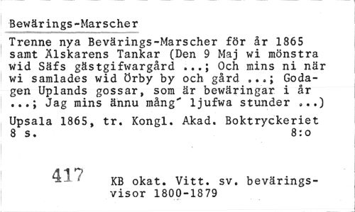 //// Bewärings-Marscher //// Trenne nya Bevärings-Marscher för år 1865 samt Älskarens Tankar (Den 9 Maj wi mönstra wid Säfs gästgifwargård Och mins ni när //// wi samlades wid örby by och gård ..»; Godagen Uplands gossar, som är bewäringar i år Jag mins ännu mång" ljufwa stunder ,..) //// Upsala 1865, tr. Kongl. Akad. Boktryckeriet 8 s. 8:o //// KB okat. Vitt. sv. bevärings- //// visor 1800-1879 ////
