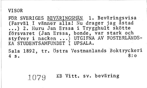 //// VISOR //// FÖR SVERIGES BEVÄRINGStlÄN 1. Beväringsvisa (Farväl I vänner alial Nu drager jag åstad ...) 2. Huru Jan Erssa i Trygghult skötte försvaret (Jan Erssa, bonde, var stark och styfver i nacken ...) UTGIFNA AV FOSTERLÄNDSKA STUDENTSAMFUNDET I UPSALA. //// Sala 1892, tr. Östra Vestraanlands Boktryckeri 4 s. 8:o //// I KB Vitt. sv. beväring ////