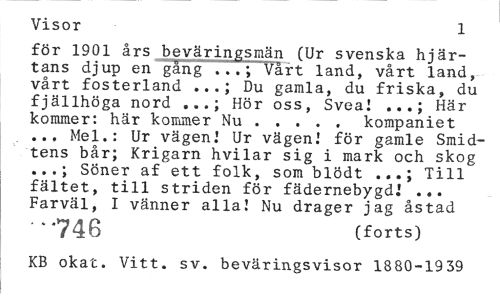 //// Visor 1 //// för 1901 års beväringsmän (Ur svenska hjärtans djup en gång ...; Vårt land, vårt land, vårt fosterland ...; Du gamla, du friska, du fjällhöga nord ...; Hör oss, Svea! ...; Här //// kommer: här kommer Nu...kompaniet //// ... Mel.: Ur vägen! Ur vägen! för gamle Smid-tens bår; Krigarn hvilar sig i mark och skog ...; Söner af ett folk, som blödt ...; Till fältet, till striden för fädernebygd! ... Farväl, I vänner alla! Nu drager jag åstad //// "746 (forts) //// KB okat. Vitt. sv. beväringsvisor 1880-1939 ////