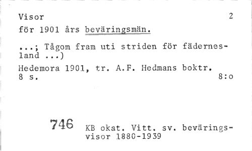 //// Visor 2 //// för 1901 års beväringsmän. //// .Tågom fram uti striden för fädernesland ...) //// Hedemora 1901, tr. A.F. Hedmans boktr. 8 s. 8:o //// 746 KB okat. Vitt. sv. bevärings- //// visor 1880-1939 ////