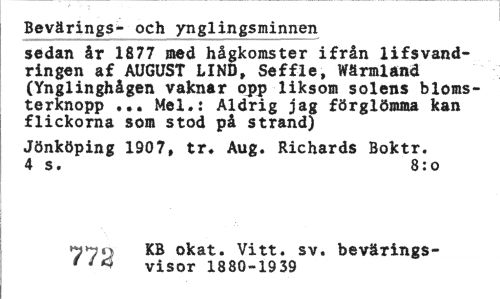 //// Bevärings- och ynglingsminnen //// sedan år 1877 med hågkomster ifrån lifsvand-ringen af AUGUST LIND, Seffle, Wärmland (Ynglinghågen vaknar opp liksom solens blomsterknopp ... Mel.: Aldrig jag förglömma kan flickorna som stod på strand) //// Jönköping 1907, tr. Aug. Richards Boktr. 4 s. 8:o //// KB okat. Vitt. sv. bevärings- //// f J 4 visor 1880-1939 ////