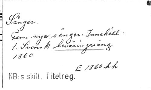 //// Sånger //// Fem nya sånger: Innehåll: //// 1. Svensk beväringssång 1860 //// E 1860 k k //// KB:s skill. Titelreg. ////