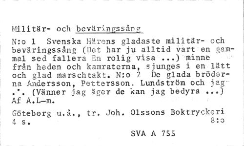 //// Militär- och beväringssång //// N:q 1 Svenska Härens gladaste militär- och beväringssång (Det har ju alltid vart en gammal sed fallera En rolig visa ...) minne från heden och kamraterna, sjunges i en lätt och glad marschtakt. N:o 2 De glada bröderna Andersson, Pettersson. Lundström och iag .*. (Vänner jag äger de kan jag bedyra ...) Af A.L-m. //// Göteborg u.å., tr, Joh. Olssons Boktryckeri //// 4 s . 8: o //// SVA A 755 ////