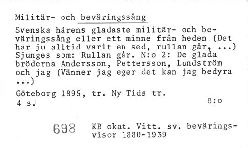 //// Militär- och beväringssång //// Svenska härens gladaste militär- och beväringssång eller ett minne från heden (Det har ju alltid varit en sed, rullan går, ...) Sjunges som: Rullan går. N:o 2: De glada bröderna Andersson, Pettersson, Lundström och jag (Vänner jag eger det kan jag bedyra //// Göteborg 1395, tr. Ny Tids tr. 4 s. 8: o //// RQg KB okat. Vitt. sv. bevärings- //// visor 1880-1939 ////