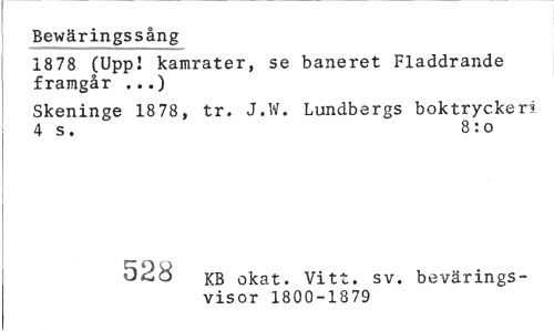 //// Bewäringssång //// 1878 (Upp! kamrater, se baneret Fladdrande framgår ...) //// Skeninge 1878, tr. J.W. Lundbergs boktryckeri 4 s. 8:o //// 747 KB okat. Vitt. sv. bevärings- //// visor 1880-1939 ////
