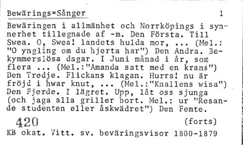 //// Bewärings=Sånger 1 //// Bewäringen i allmänhet och Norrköpings i synnerhet tillegnade af -m. Den Första. Till Swea. 0, Sweai landets hulda mor, ... (Mel.: "0 yngling om du hjerta har") Den Andra. Be-kymmerslösa dagar. I Juni månad i år, som flera ... (Mel.:"Amanda satt med en krans") Den Tredje. Flickans klagan. Hurra! nu är fröjd i hwar knut, ... (Mel.:"Knallens wisa") Den Fjerde. I lägret. Upp, låt oss sjunga (och jaga alla griller bort. Mel.: ur "Resande studenten eller åskwädret") Den Femte. //// 420 (forts) //// KB okat. Vitt. sv. beväringsvisor 1800-1879 ////
