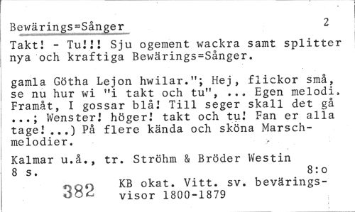 //// Bewärings=Sånger 2 //// Taktl - Tu!JI Sju ogement wackra samt splitter nya och kraftiga Bewärings=Sånger. //// gamla Götha Lejon hwilar."; Hej, flickor små, se nu hur wi "i takt och tu", ... Egen melodi, Framåt, I gossar blå.' Till seger skall det gå ...; Wenster! höger! takt och tu! Fan er alla tage! ...) På flere kända och sköna Marschmelodier. //// Kalmar u.å., tr. Ströhm & Bröder Westin 8 s. 8:0 //// ^00 KB okat. Vitt. sv. bevärings- //// ÖOC visor 1800-1879 ////