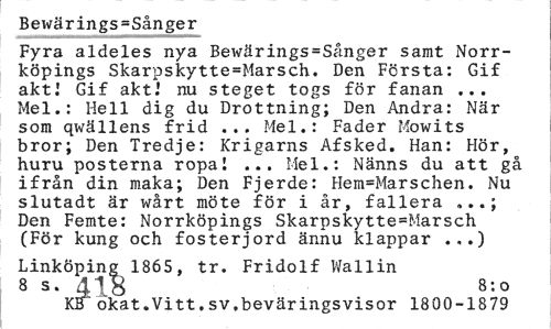 //// Bewärings=Sånger //// Fyra aldeles nya Bewärings=Sånger samt Norrköpings Skarpskytte=Marsch. Den Första: Gif akt.' Gif akt.' nu steget togs för fanan ... Mel.: Hell dig du Drottning; Den Andra: När som qwällens frid ... Mel.: Fader Mowits bror; Den Tredje: Krigarns Afsked. Han: Hör, huru posterna ropa! ... Mel.: Nänns du att gå ifrån din maka; Den Fjerde: Hem=Marschen. Nu slutadt är wårt möte för i år, fallera ...; Den Femte: Norrköpings Skarpskytte=Marsch (För kung och fosterjord ännu klappar ...) //// Linköping 1865, tr. Fridolf Wallin //// 8 s. 41g 8:o //// KB"okat.Vitt,sv.beväringsvisor 1800-1879 ////