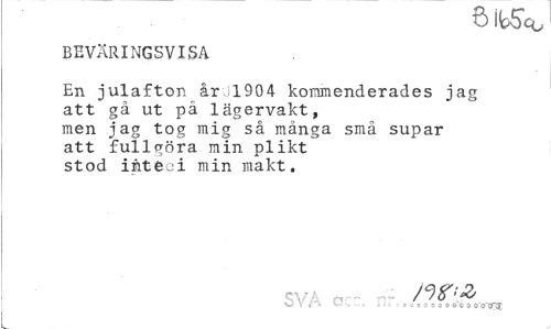 //// t) IbÖco //// BEVÄRINGSVISA //// En julafton årul904 kommenderades jag //// att gå ut på lägervakt, //// men jag tog mig så mänga små supar //// att fullgöra min plikt //// stod inte :i min makt. //// w V i V-/ . . a ; o c c 3 o o c 0 0"0"CT§ ////