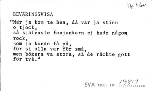 //// llle1'^ //// BEVÄRINGSVISA //// "När ja kom te hea, då var ja stinn o tjock, //// så självaste fanjunkarn ej hade någon rock, //// som ja kunde få på, //// för si alla var för små, //// men böxera va stora, så de räckte gott //// för två.'' //// SVA gcc. nr.. ////