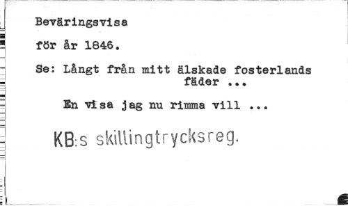 //// Beväringsvisa //// \ för år 1846. //// Se: Långt från mitt älskade fosterlands - fäder ... //// En visa jag nu rimma vill ... //// ^ KB.s skillingtrycksreg. //// å ////