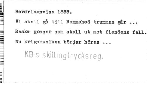 //// L Beväringsvisa 1855. //// J Vi skall gå till Rommehed trumman gar ... //// 5 Raska gossar som skall ut mot fiendens fall. //// : Nu krigsmusiken börjar höras ... //// = KB.s skillingtrycksreg. ////