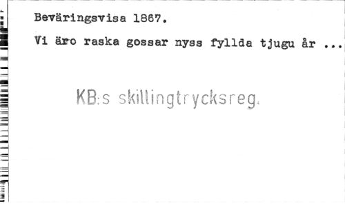 //// j Beväringsvisa 1867. k //// I Vi äro raska gossar nyss fyllda tjugu år ... a //// | KB s skillingt rycks reg, //// 3 ////