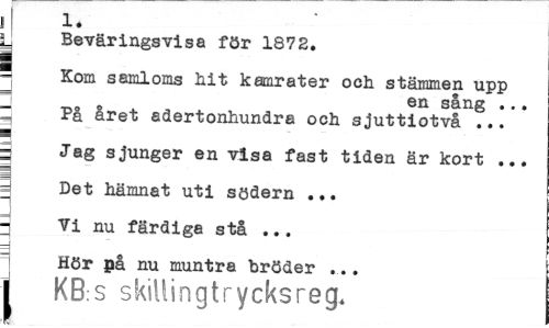 //// ! //// y Beväringsvisa för 1872. //// - Kom samloms hit kamrater och stämmen upp //// en sång ... //// 3 På året adertonhundra och sjuttiotvå ... //// 3 //// a Jag sjunger en visa fast tiden är kort ... 3 Det hämnat uti södern ... 3 Vi nu färdiga stå ... //// Hör på nu muntra bröder ... //// i KB s skillingtrycksreg. ////