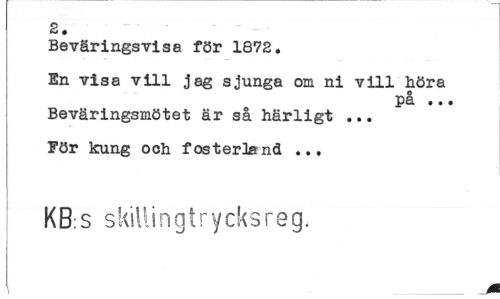 //// 2. //// Beväringsvisa för 1872, //// En visa vill jag sjunga om ni vill höra //// på ... //// Beväringsmötet är så härligt ... För kung och fosterland ... //// KB:S skiUingtn/cksreg. ////