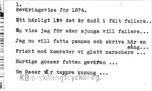 //// 1. //// Beväringsvisa för 1874. //// * Ett härligt ltv det är ändå i fält fallera., //// En visa jag för eder sjunga vill fallera... //// | Jag nu vill fatta pennan och skriva här en = sång... //// - Friskt mod kamrater vi glatt marschera ... //// 2 Hurtiga gossar fatten geväfen ... //// Om Oscar \Sr. tappre konung ... //// KB:s skiUingirycksreg. //// m * //// i ////