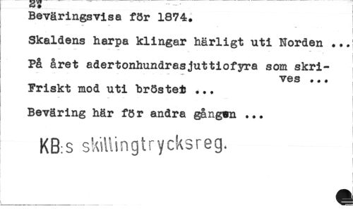 //// Beväringsvisa för 1874. //// Skaldens harpa klingar härligt uti Norden ... //// På året adertonhundrasjuttiofyra som skrives ... //// Friskt mod uti bröstet ... Beväring här för andra gångwn ... //// KB:S skillingtrycksreg. //// « ////