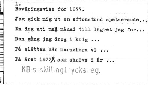 //// 1. //// Beväringsvisa för 1877. //// Jag gick mig ut en aftonstund spatserande..< = En dag uti månad till lägret jag for... 5 Den gång jag drog i krig ... //// På slätten här marschera vi ... 2 På året 1877$ som skrivs i år ... //// = KB.s skillingtrycksreg, //// i ////
