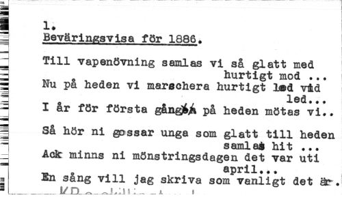 //// - //// i 1. //// 3 Beväringsvisa för 1886. //// Till vapenövning samlas vi så glatt med 5 hurtigt mod ... //// 5 Nu på heden vi marschera hurtigt Lod våd //// - led... 2 I år för första gång£A på heden mötas vi,. //// g Så hör ni gossar unga som glatt till heden = samlaå hit ... //// - Ack minns ni mönstringsdagen det var uti -j april... //// I En sång vill jag skriva som vanligt det är- //// ä I___)/n ~ ti-__A I ////