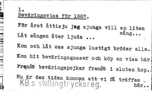 //// L 1# //// i Beväringsvisa för 1887. //// I För året åttisju jag sjunga vill en liten //// sang... //// 5 Låt sången åter ljuda ... //// Kom och låt oss sjunga lustigt bröder alla. Kom hit beväringsgossar och köp en visa här q Framåt beväringspojkar framåt i sluten hop. d Nu är den tiden kommen att vi få träffas „ //// KB:S skiUinqtrycksreq. nar.. ////