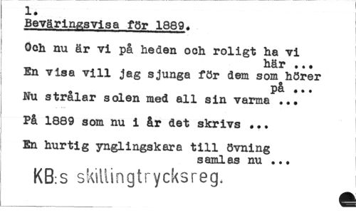 //// 1. //// Beväringsvisa för 1889. //// Och. nu är vi på heden och roligt ha vi //// här ... //// En visa vill jag sjunga för dem som hörer //// på ... //// Nu strålar solen med all sin varma ... //// På 1889 som nu i år det skrivs ... //// En hurtig ynglingskara till övning //// samlas nu ... //// KB:S skillingtrycksreg. //// « ////