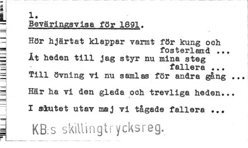 //// u i. //// Beväringsvisa för 1891. //// ~ Hör hjärtat klappar varmt för kung och //// ¦ __ fosterland ... //// - Åt heden till jag styr nu mina steg i fallera ... //// = Till övning vi nu samlas för andra gång ... //// i Här ha vi den glada och trevliga heden... //// 3 //// n I slutet utav maj vi tågade fallera ... //// i KB.s skiliingtrycksreg* //// *___ _ ////