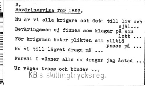 //// 2. //// y Beväringsvisa för 1895, ¦ //// Nu är vi alla krigare och det": till liv och //// själ... //// Beväringaman ej finnes som klagar på sin ~ lott ... //// | För krigsman heter plikten att alltid B passa på ... //// i Nu vi till lägret draga må ... //// " Farväl I vänner alla nu drager jag åstad .. //// Ur vägen tross och bönder ... //// i KB:S skillingtrycksreg, ////